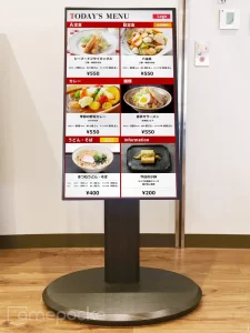 | 製品仕様・サービス | 43インチ 業務用液晶ディスプレイ(輝度 450cd/㎡)・木製スタンド 食堂メニュー表示システム ChoicEat |