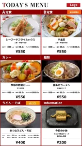 ディスプレイに表示する5つの日替わりメニューは、画像やメニュー名、栄養成分を表示、またインフォメーションが入力できる欄も設けており、利用者はパッと見てメニューを選びやすくなったと大変好評です。