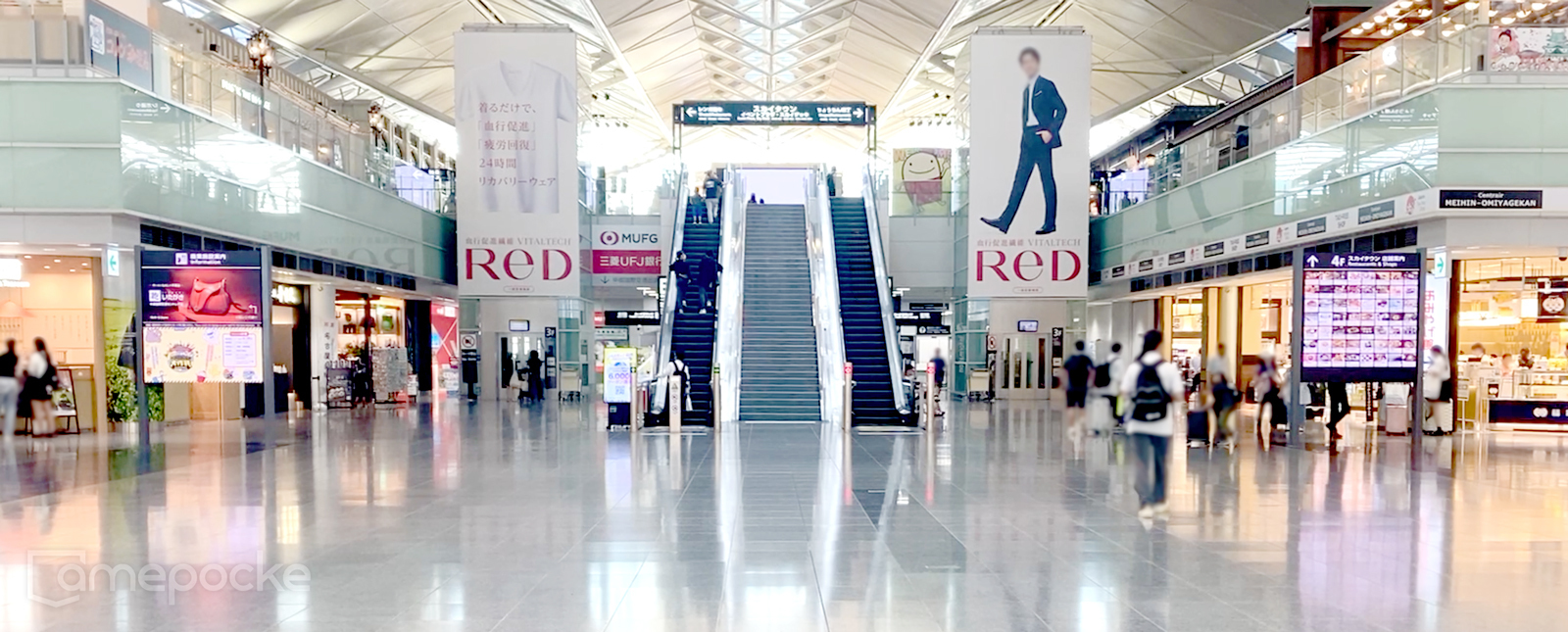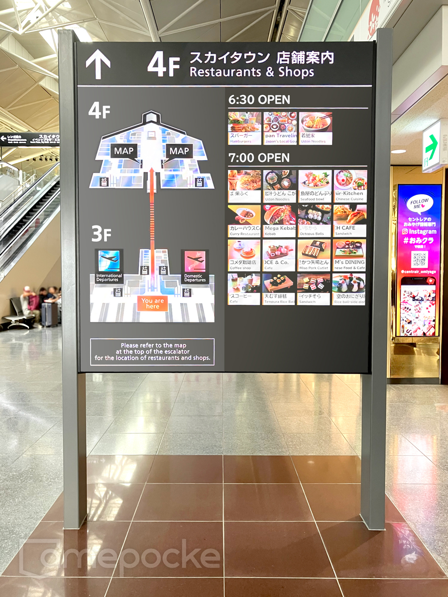 LEDビジョンは第1ターミナルビル3Fから4Fへのエスカレーター付近に2台設置されており、広告やイベントのPR、営業中の店舗情報に加え、案内表示としての役割も担っています。