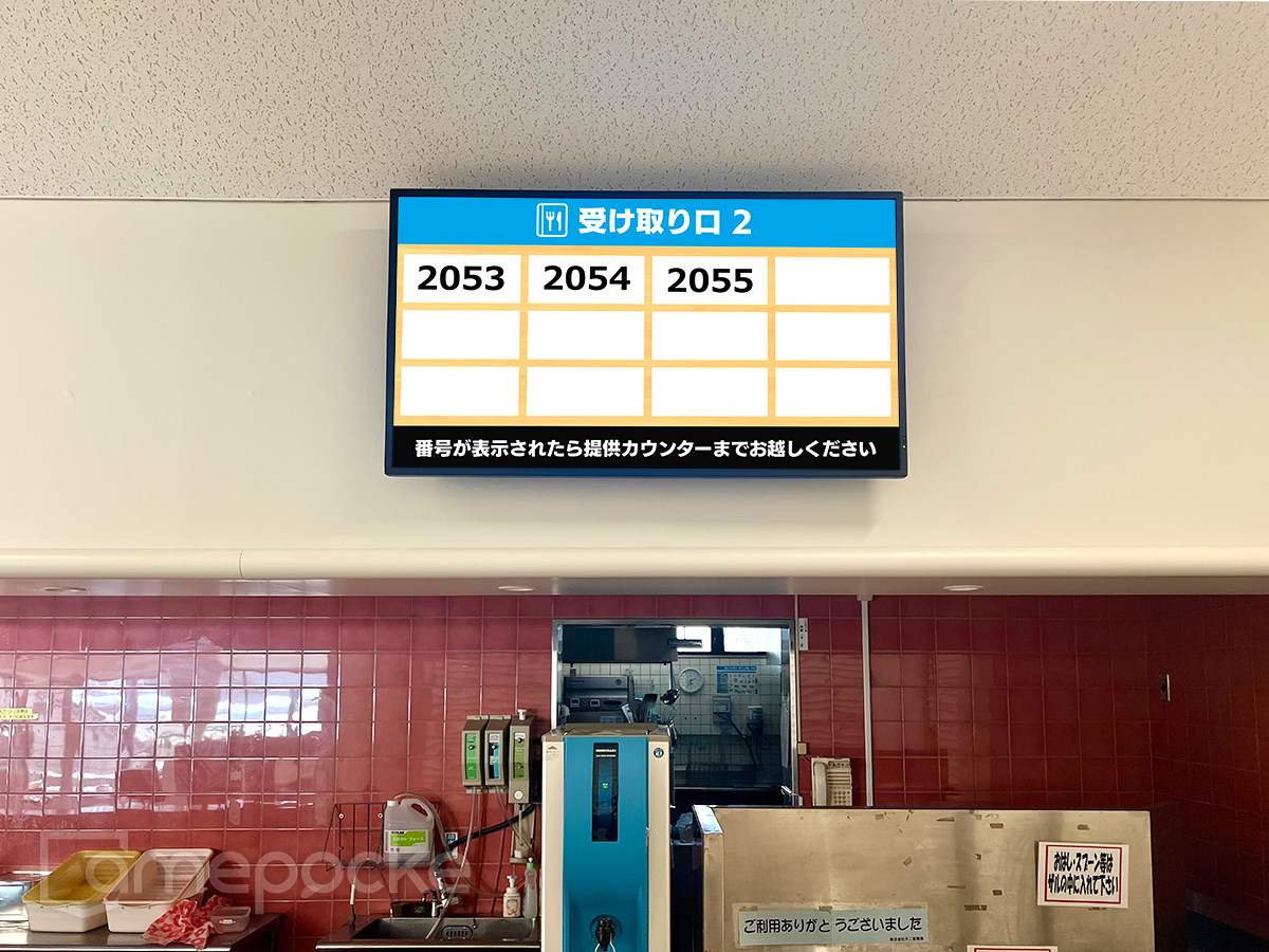 ディスプレイは提供口5台と食堂ホールに2台で、呼び出す番号をどこからでも確認できるように設置しました。