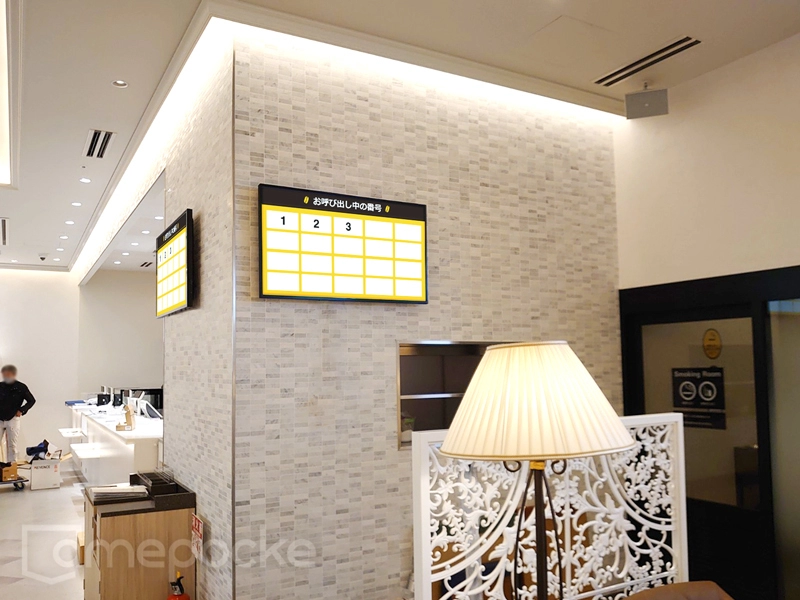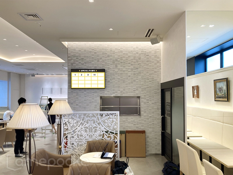 お客様に出来上がったメニューをスムーズに取りにきていただけるよう、広い店内には2台のディスプレイを設置し、呼び出し番号表示を行なっています。呼び出しの際は番号が表示されるとともに効果音がなる仕様で、お客様もストレスなく呼び出し状況を確認できます。