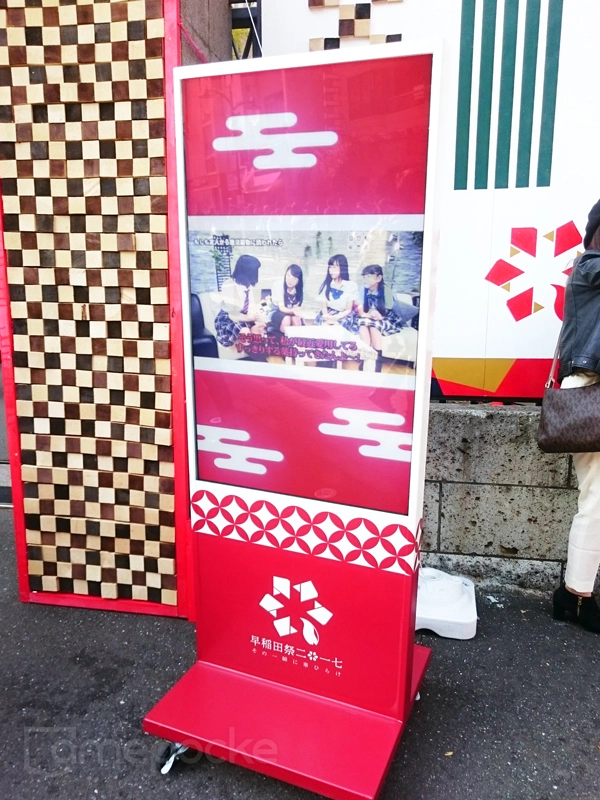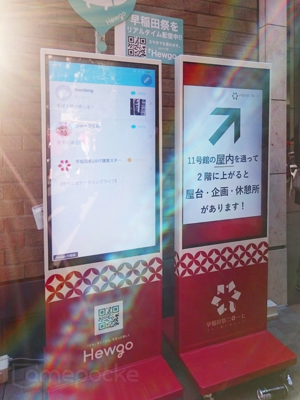 またキャンパス内には計10台のデジタルサイネージを設置し、早稲田祭2017運営側からのインフォメーション、 出展団体の誘致投稿、 ユーザーの投稿など、 今その場で起こっているコトを投稿(ピン)によって可視化し、来場者にイベントの盛り上がりをリアルタイムに発信しました。