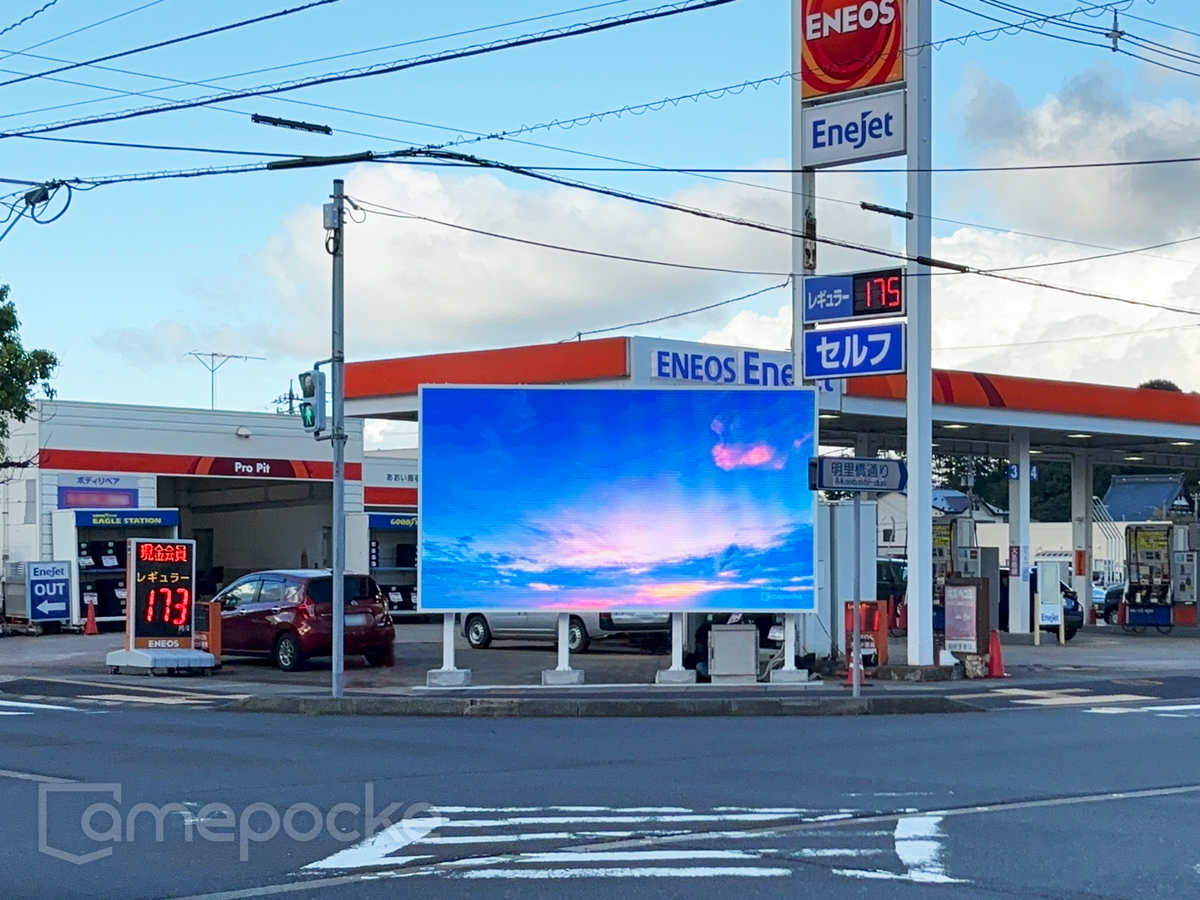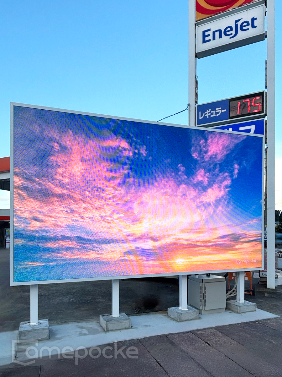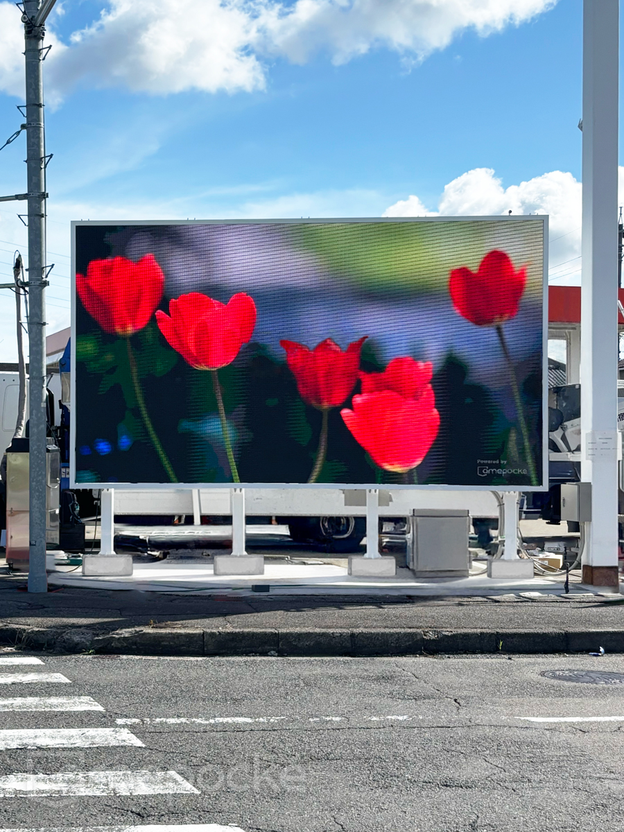 運営する複数の給油所の中から、今回はまず2つのガソリンスタンドを選定し同時にLEDビジョンを設置。交通量の多い県道沿いの高視認性を活かし、今後は広告メディアとしても活用されます。