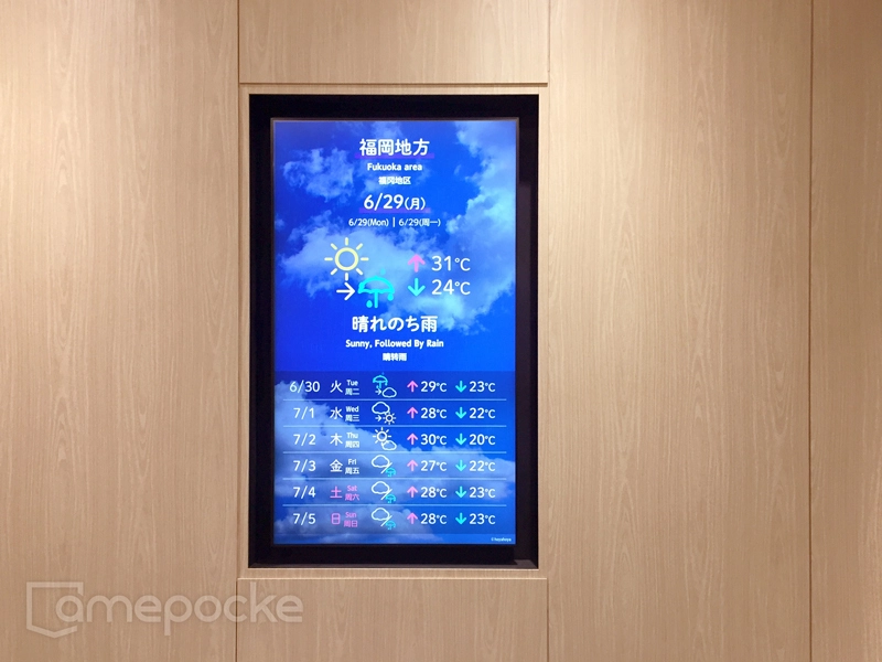 管理会社からのお知らせやテナントのコンテンツなど 毎月更新をおこなうとともに、動く天気予報も放映しています。