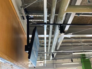 現地の状況をヒアリングし、ディスプレイは1台をスタンド、3台を天吊りで設置することとなり、設置工事・組み立ても弊社で承りました。