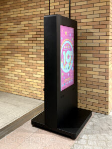 1階共用スペースに設置されたディスプレイは、防塵防水仕様のスタンド一体型で高輝度2,500cd/㎡。