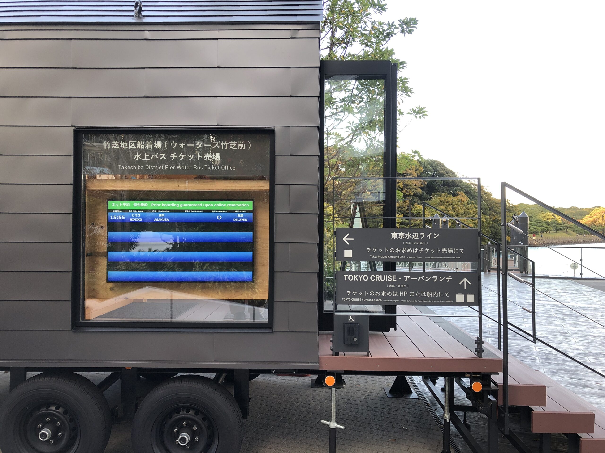 ウォーターズ竹芝にある浜松町乗り場は、切符売場のあるトレーラーハウス内の窓際より外向きに設置しました。
