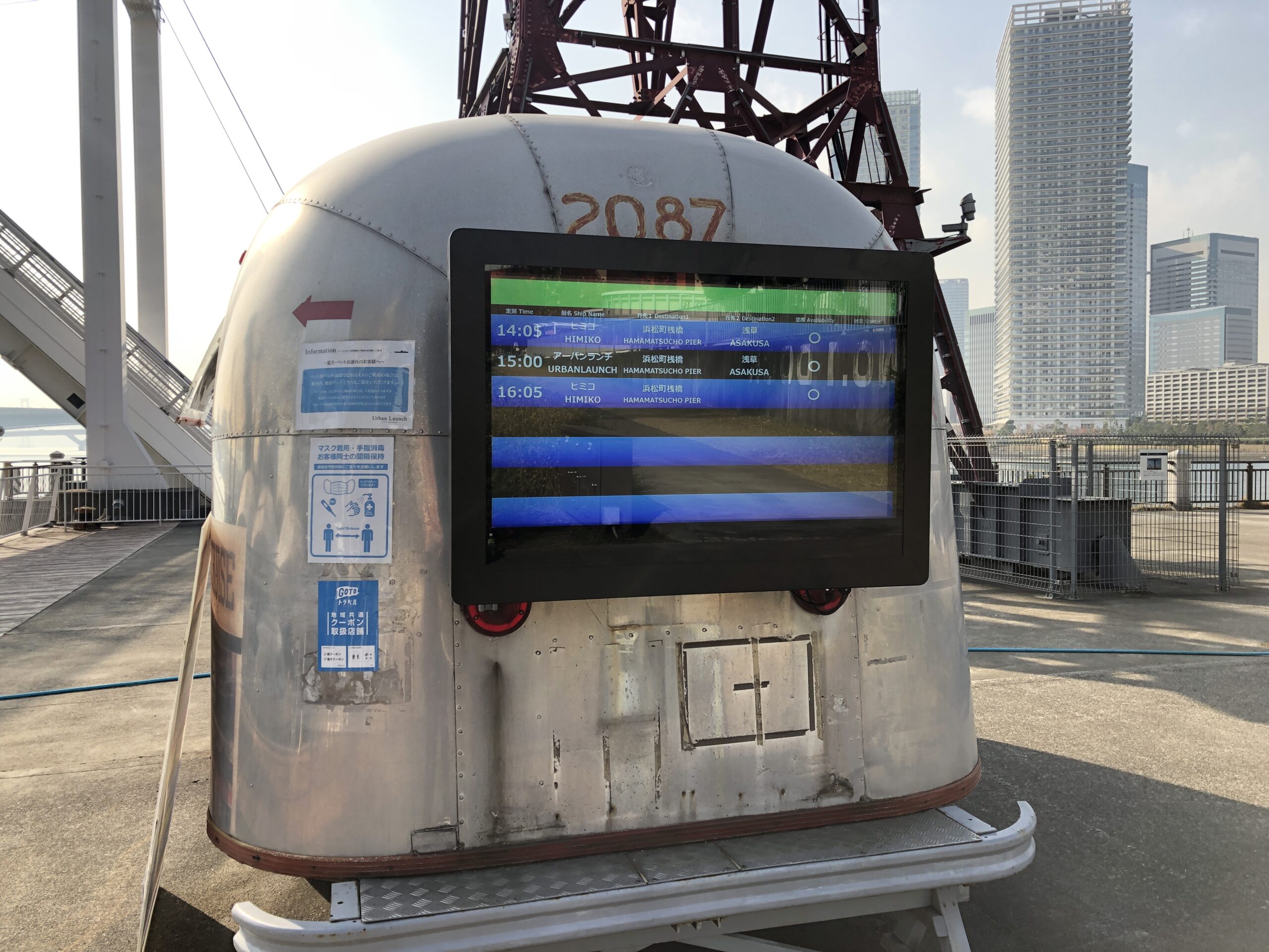 豊洲乗り場は、ららぽーと豊洲内 船着き場のトレーラーハウスに屋外用ディスプレイを設置。