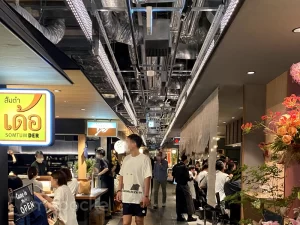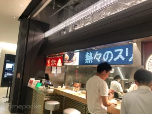 “たこ焼きで世界を旅する”をコンセプトに、期間ごとに各国の名物料理をモチーフにしたメニューを提案する 屋台風のお店には、スタイリッシュな86インチの細長いウルトラストレッチサイネージ 2台を設置。