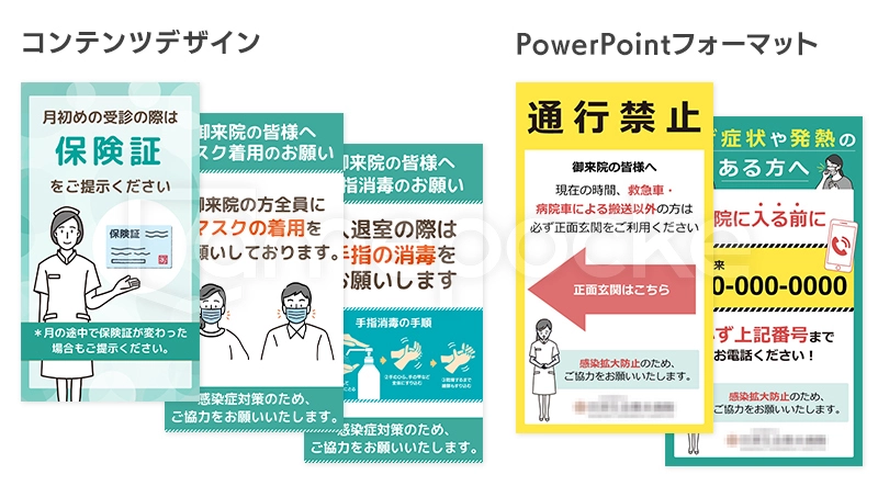また、フォーマットの制作もおこない、病院ご担当者がPowerPointで簡単に文字等入れ替えて随時更新いただきご活用いただいています。