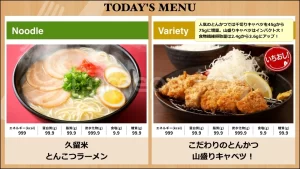 | 製品仕様・サービス | 食堂メニュー表示システムChoicEat(チョイスイート) 画面イメージ(1画面に1メニュー) 画面イメージ(1画面に2メニュー) フェアメニューやイベント告知などをおこなうサイネージは、食堂事務所よりLAN配信 |