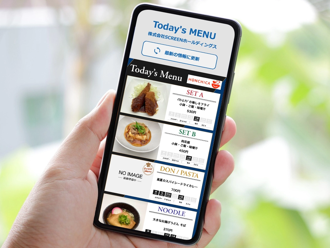 食堂運営において、調理サンプルの廃棄とコストが課題で、SDGsの観点からもメニューをデジタル化し綺麗な日替わりメニューの表示を容易に、また社内向けお知らせの掲示などの情報管理業務を、食堂メニュー表示システムと一元化することで効率化を図れることが今回の導入検討の背景です。