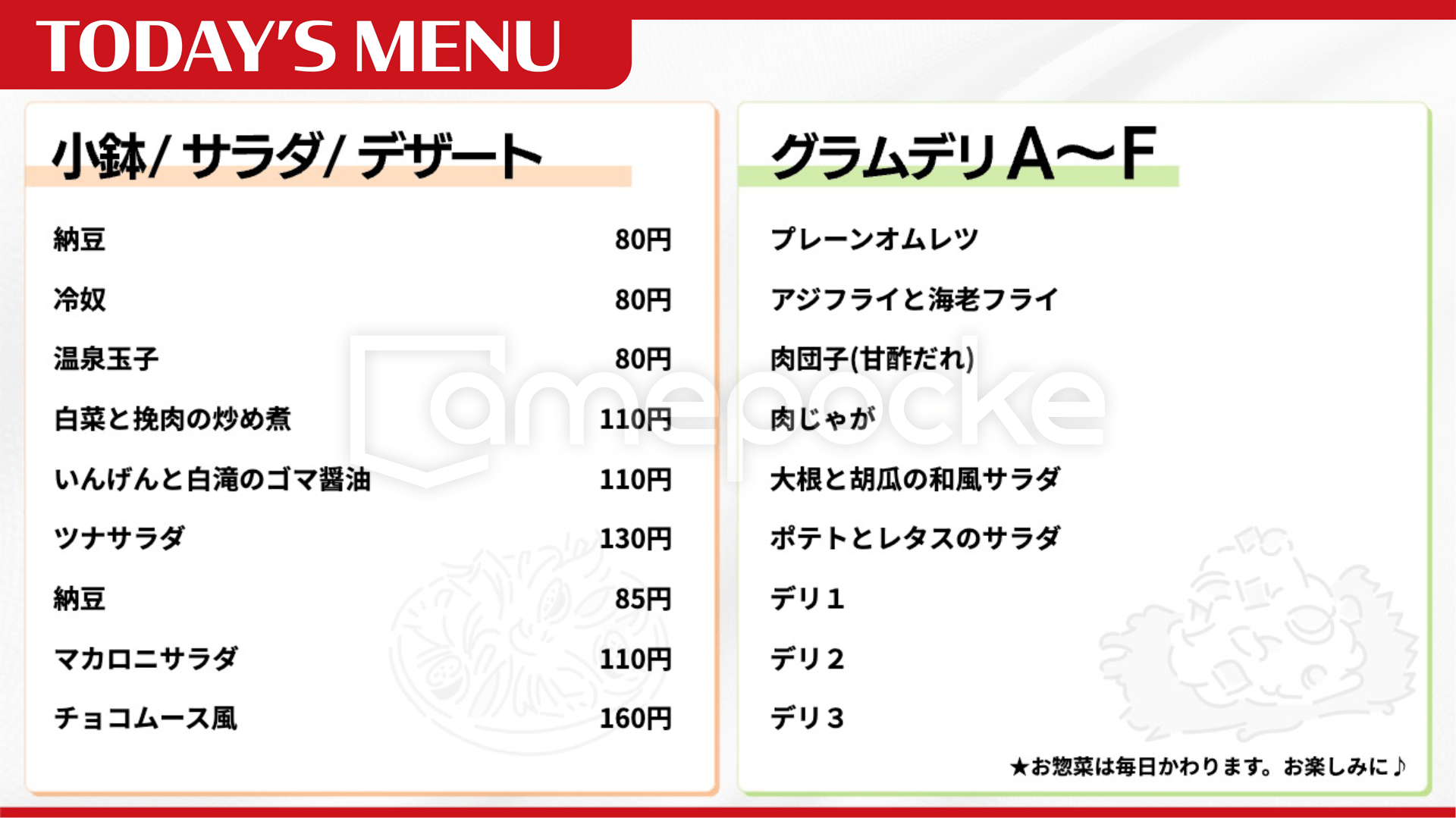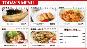 導入したディスプレイでは、画像付きの日替わりメニューに加え、小鉢やグラムデリなど副菜の提供内容も表示。利用者は食堂に設置されたディスプレイだけでなく、個人のスマートフォンからも事前にメニューを確認できます。