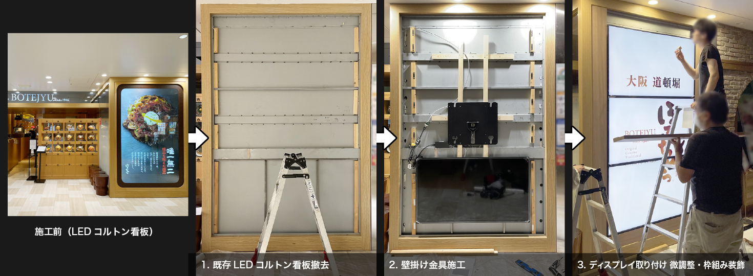 | 製品仕様・サービス | 屋内用 55インチ 輝度450cd/㎡ 超薄型ディスプレイ 3面 同期ネットワーク配信 |