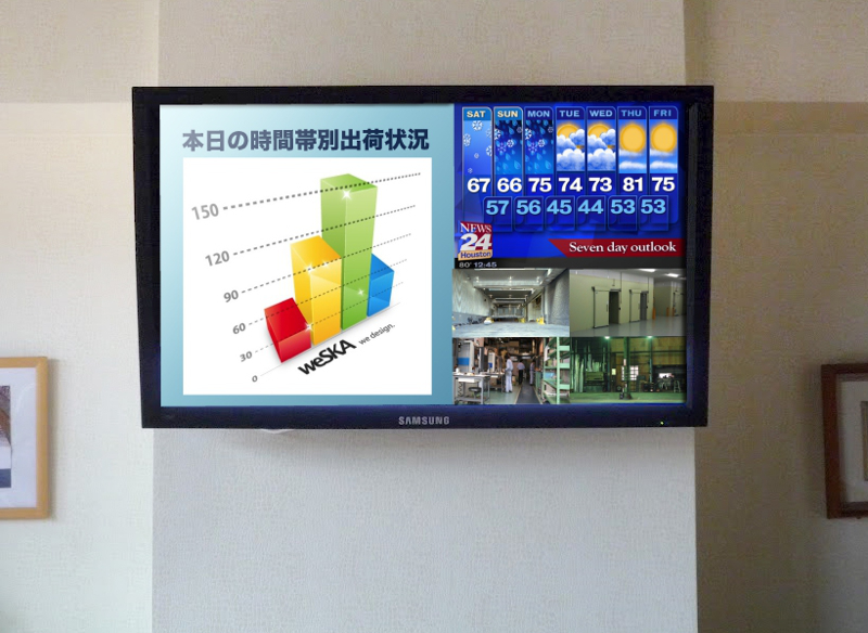 デジタルサイネージは、流すコンテンツをあらかじめスケジューリングできるためタイムリーで効果的に、業務上の情報周知もできます。