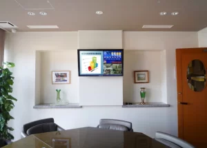 このオフィスサイネージは、各種情報の周知や社内コミュニケーションの活性化が狙いとなっています。