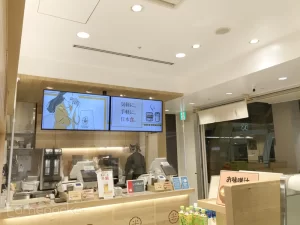 和モダンな雰囲気の店内カウンター上に、ディスプレイ2面のデジタルメニューボードをご導入いただきました。羽田空港第2ターミナルの63番搭乗ゲート前に位置し、通路からでも大迫力の2画面で、こだわりの国産米、フレッシュな野菜とボリュームたっぷりの具材をビジュアルに紹介し、メニューを訴求しています。コンテンツも弊社のデザインです。