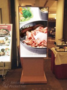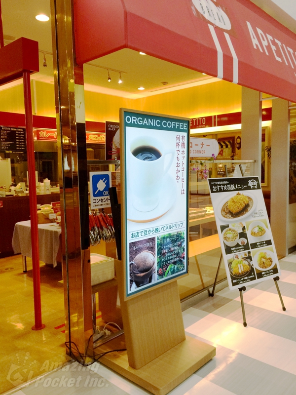 ディスプレイのフレームと可動式スタンドは、ロイヤルコーヒーショップ様の雰囲気に合わせて暖かみのある木目調にカスタマイズしています。