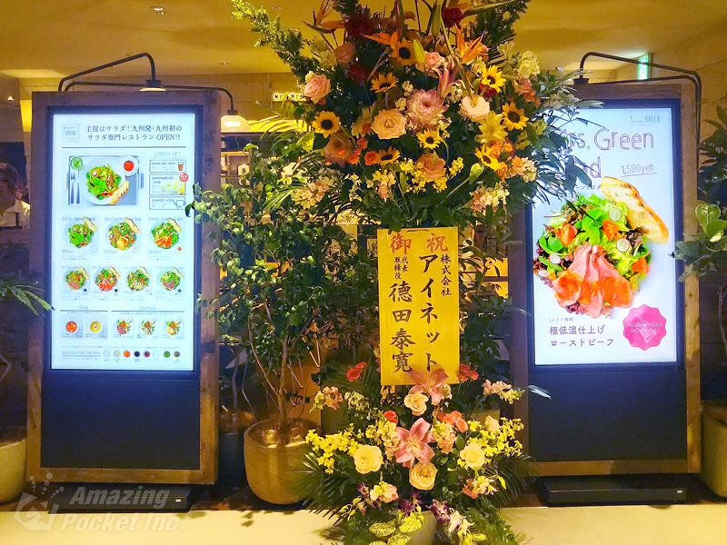 2016年4月27日 ソラリアプラザ7F飲食フロアにNEW OPENした『Salad Restaurant Mr.&Mrs.Green(ミスターアンドミセスグリーン)』様にてデジタルサイネージをご導入いただきました。