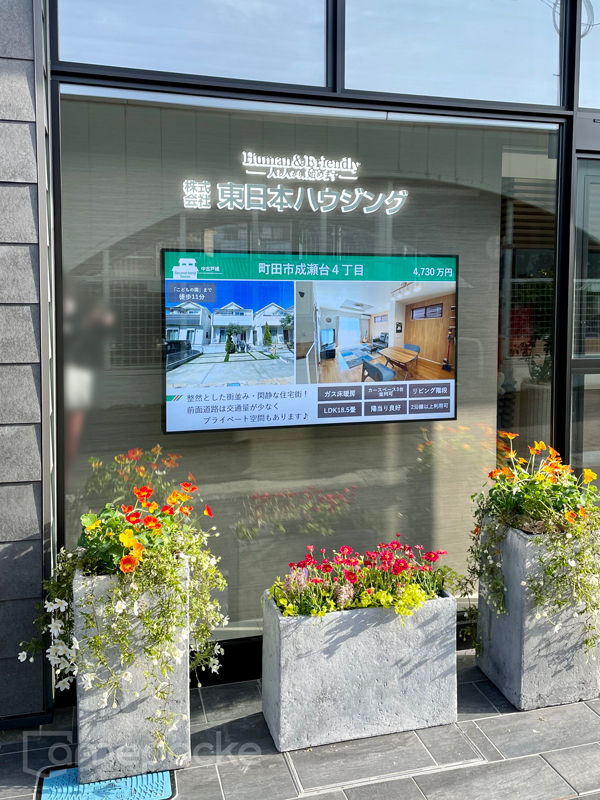 本店は以前に他社からデジタルサイネージを導入されていましたが、不具合時の対応や配信ソフトウェアの操作性に課題をお持ちで弊社にご相談があり、今回窓際にデジタルサイネージをご採用いただきました。