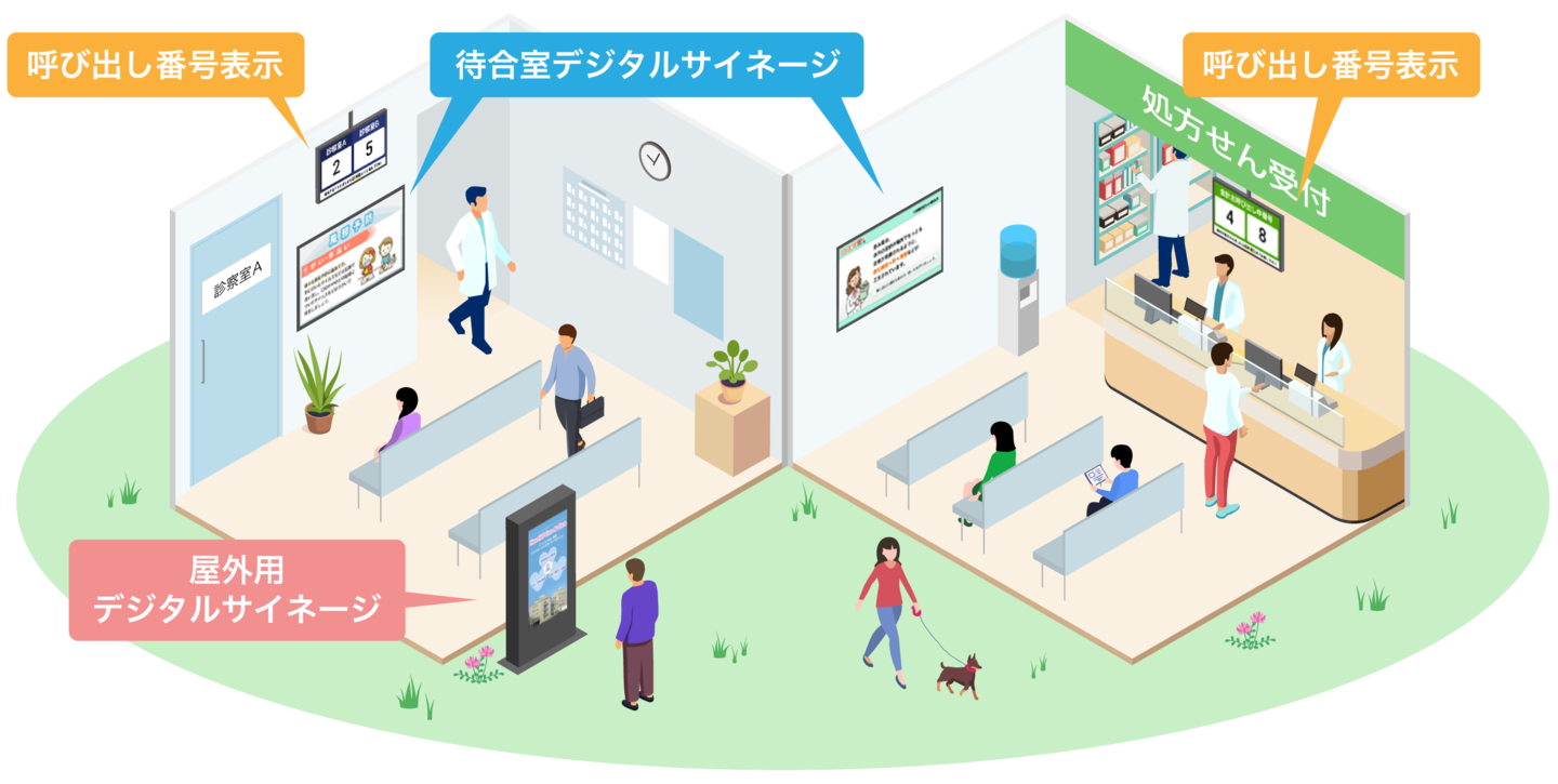病院やクリニック、処方せん薬局など医療機関では、待合室で患者様向けの情報表示や呼び出し番号のほか、屋外入口等で情報伝達のため、デジタルサイネージが利用されています。