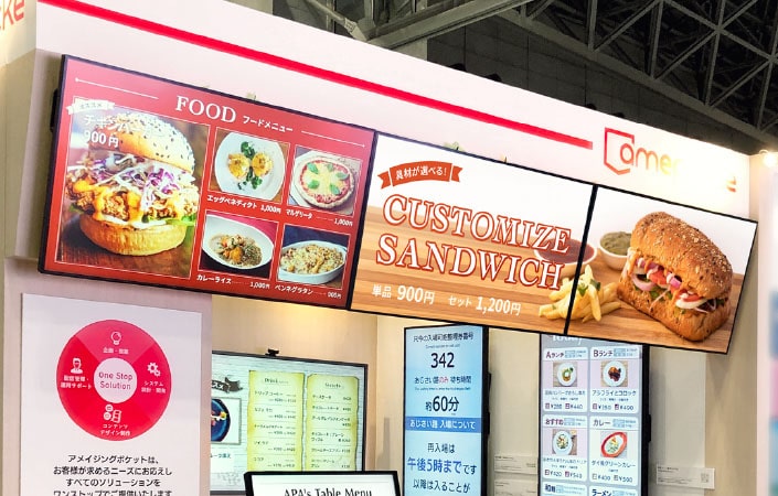紙のメニュー表やポスターと違い、即時に内容を更新できる点や、動画・アニメーションでの訴求力が特長です。